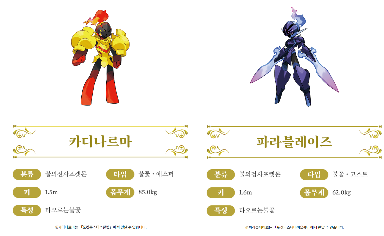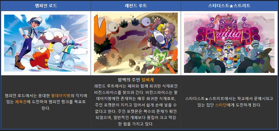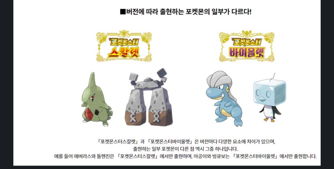 버전에 따라서 주인공과 박사, 학교의 이름 문장 및 교복이 다르고, 페퍼라는 인물이 들고다니는 먼 과거에 쓰인 탐험기가 적혀있는 북이 다르며, 등장하는 포켓몬이 조금 씩 다른게 특징입니다.